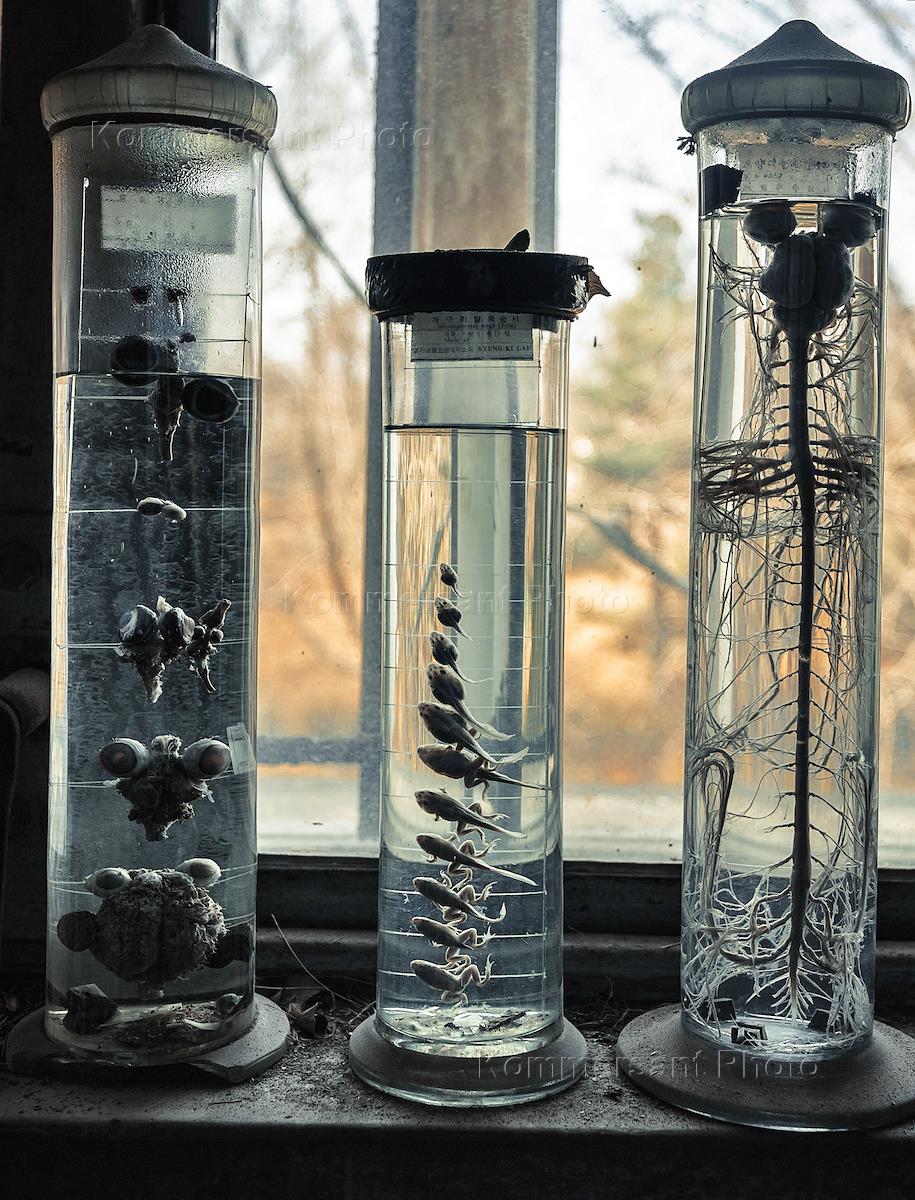 Заброшенная научная лаборатория в пригороде Сеула. Жанровая фотография. Колбы с животными в…