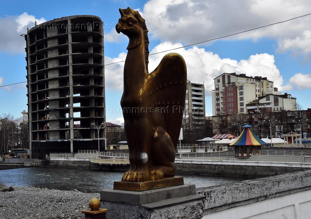 Виды Владикавказа. Набережная реки Терек. Скульптура барса на опоре моста через Терек.