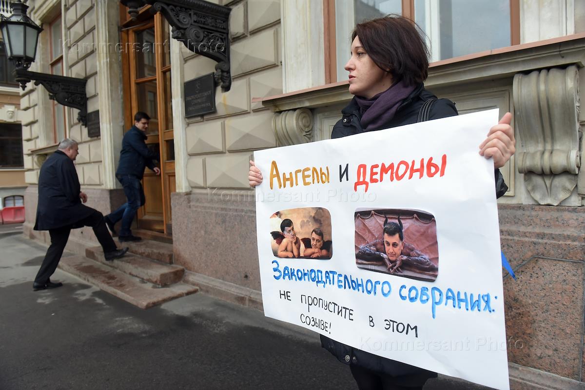 Участница одиночного пикета у здания Законодательного собрания Санкт-Петербурга (ЗакС).