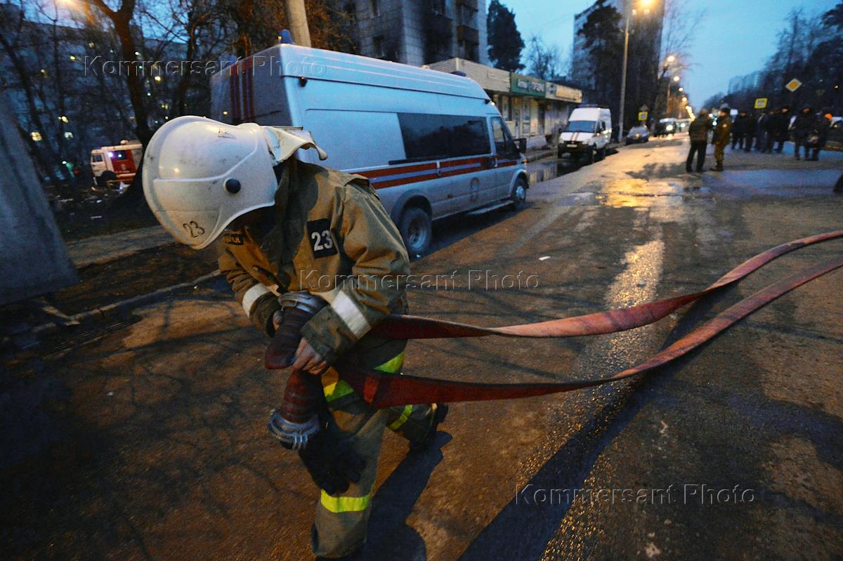 Сотрудники МЧС России и полицейские во время устранения последствий взрыва бытового газа и пожара в…