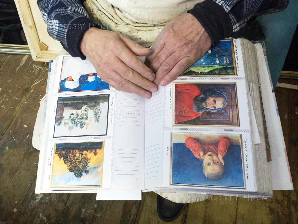 Династия художников из Тотьмы Сажиных. Художник Николай Сажин в своей мастерской пишет картину…