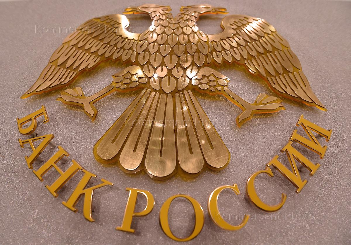 Жанровая фотография. Столбики ограждения с эмблемой Центрального Банка (ЦБ) России на тротуаре у…