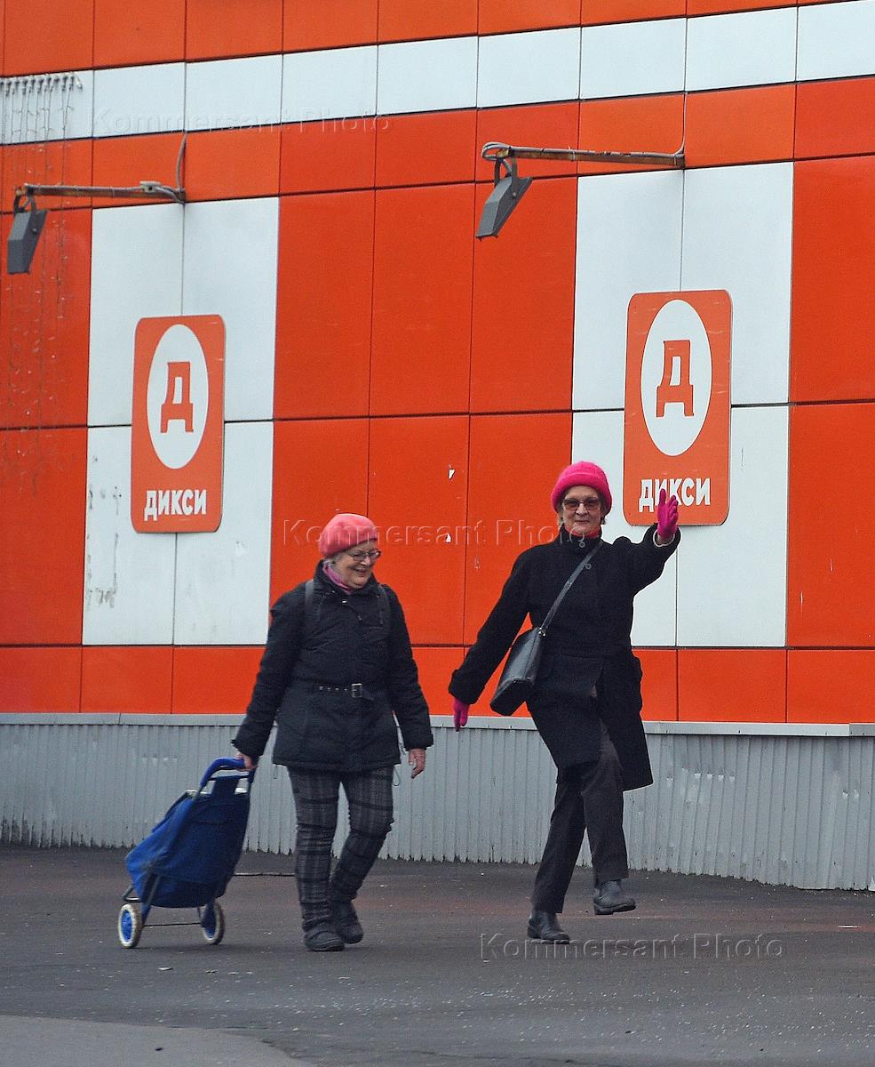 Магазин розничной сети "Дикси". Женщины идут вдоль стены магазина.
