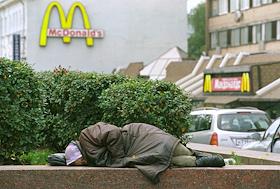 Виды Москвы. Жанровая фотография. Женщина-бомж спит на парапете в Новопушкинском сквере.