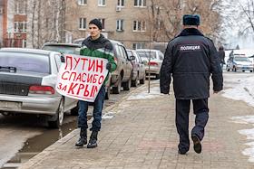 Жанровая фотография. Молодой человек держит плакат "Путин, спасибо за Крым".
