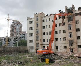 Расчистка площадки под строительство третьей очереди торгово развлекательного центра "Гринвич" в центре Екатеринбурга. Снос пятиэтажного жилого дома.