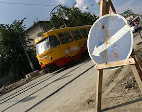 Жанровая фотография. Дорожный знак "поворот налево" на фоне проезжающего трамвая.