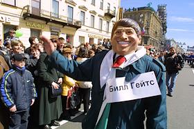 Огромный бюст основателя города - Петра Великого на праздничном карнавальном шествии по Невскому…