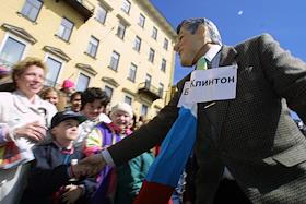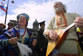 Люди в русских национальных костюмах с балалайкой на праздничном карнавальном шествии по Невскому…