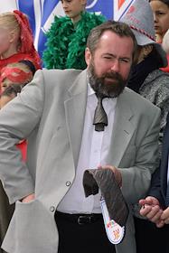Колонна дворников на праздничном карнавальном шествии по Невскому проспекту в День рождения города.