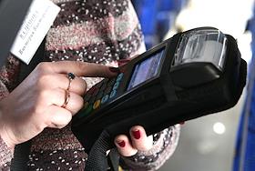 жанровая фотография. Кондуктор держит в руках новый валидатор системы оплаты проезда льготниками по…