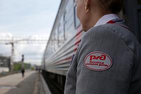 Пассажирский поезд на станции Пермь-2. Проводник поезда с эмблемой РЖД на рукаве.