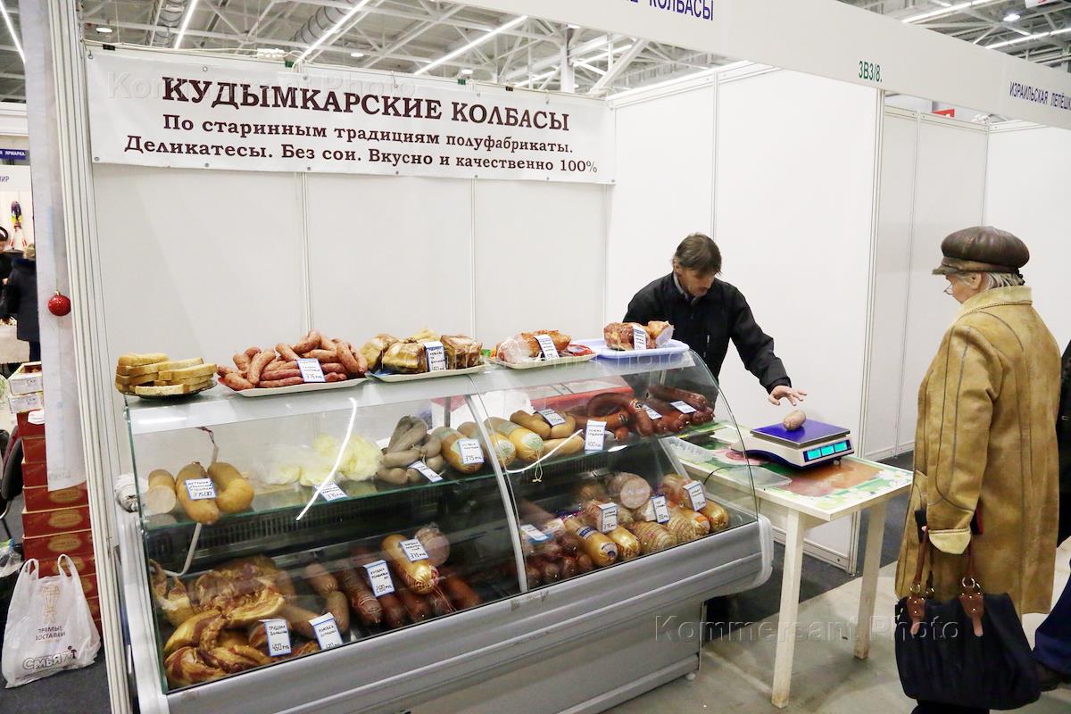 Новогодняя ярмарка. Торговля продовольственными товарами. Кудымкарские колбасы, витрина с…