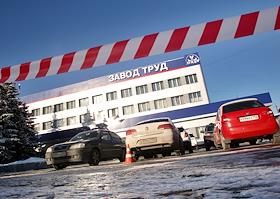 Здание завода "Труд" и автомобильная парковка на площади перед зданием.