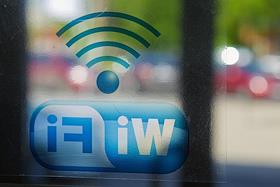 Жанровая фотография. Табличка с обозначением беспроводной сети Wi-Fi на прозрачной двери.