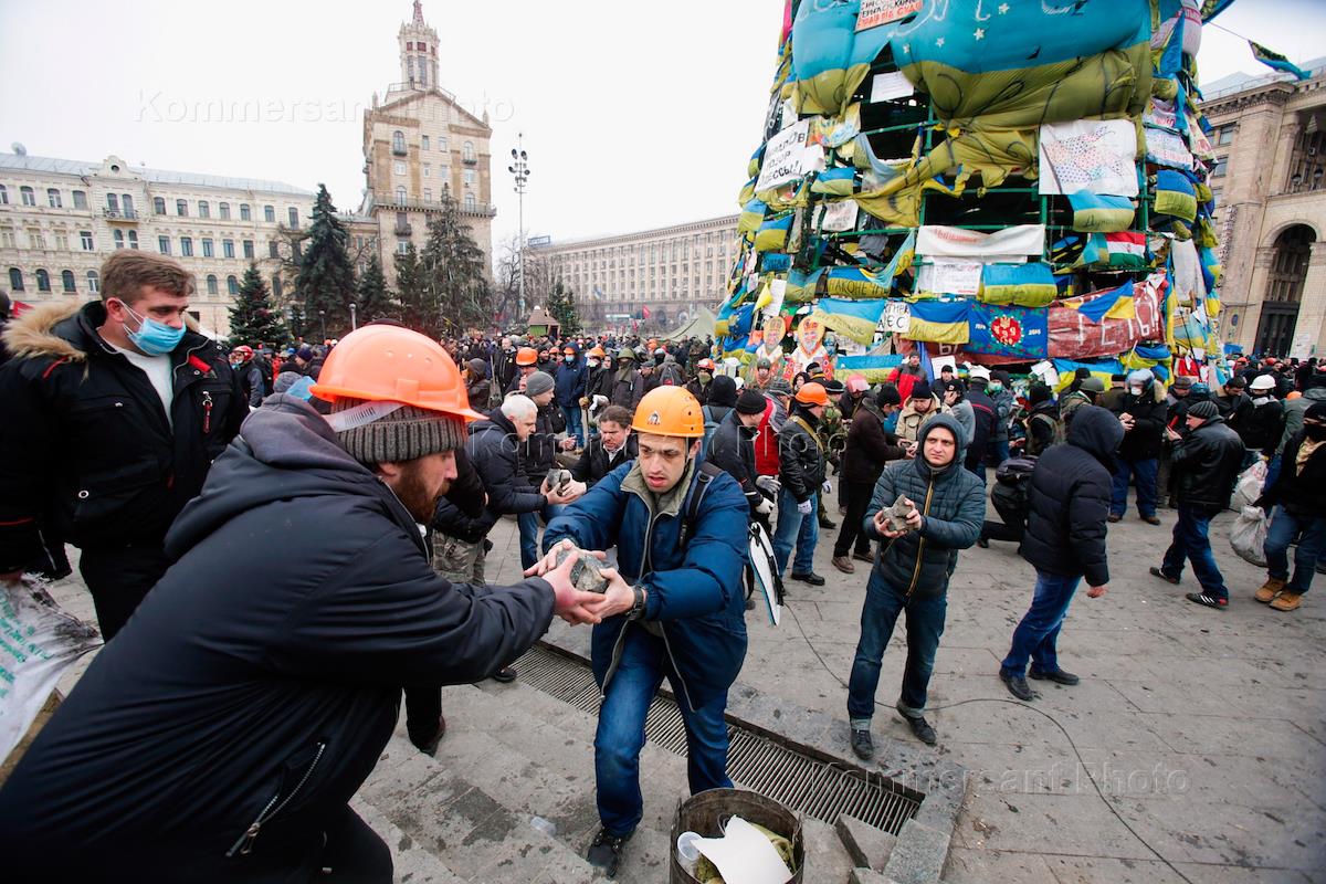 Евромайдан после ночи противостояния. Уличные бои не утихают. Сбор брусчатки.