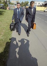 Адвокаты Платона Лебедева Евгений Бару (слева) и Антон Дрель (справа) после заседания Московского…