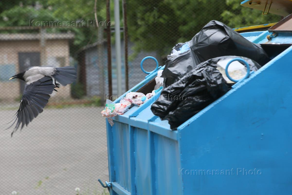 Жанровая съемка "Жилищно-коммунальный комплекс (ЖКХ)". Птица, уносящая добычу из мусорного бака в…