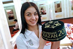 Сертифицированные товары Универсиады 2013. Девушка держит тюбетейку с символикой Универсиады 2013.