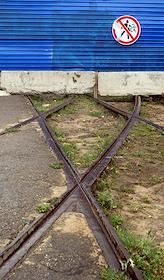 Виды Нижнего Новгорода. Железнодорожные (трамвайные) рельсы уходят под забор с дорожным знаком…