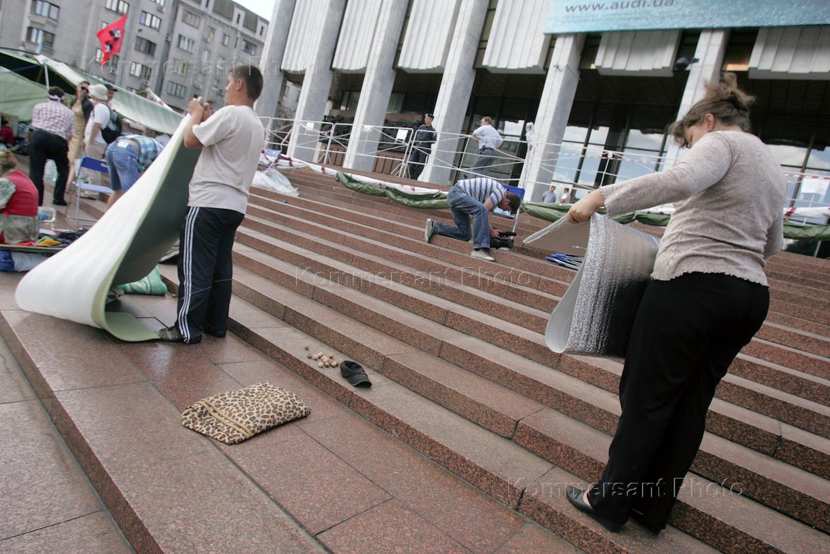 Участники акции голодовки против языкового закона собирают вещи под Украинским домом.