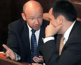 Член Совета Федерации России, председатель Московской городской Думы Владимир Платонов (слева) на…