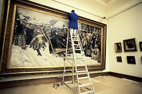 Сотрудник Государственной Третьяковской галереи завершает работу по размещению картины Василия…