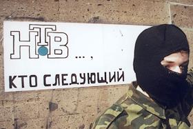Участник митинга в поддержку телекомпании НТВ с транспарантом, в маске и камуфляжной форме. Причиной…