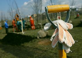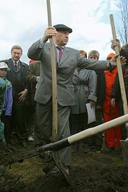 Мэр г.Москвы Ю.Лужков сажает деревья на субботнике в Приречном парке в долине реки Сетунь