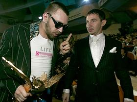 Лидер группы "Ленинград" Сергей Шнуров (слева) и кинорежиссер Петр Буслов (справа) на торжественной…