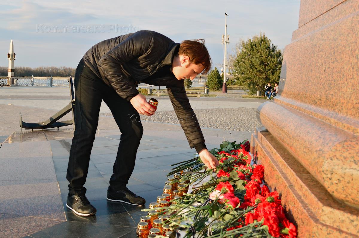 Возложение цветов к памятнику Петру I на набережной Астрахани в память о погибших во время взрыва в метро Санкт-Петербурга.