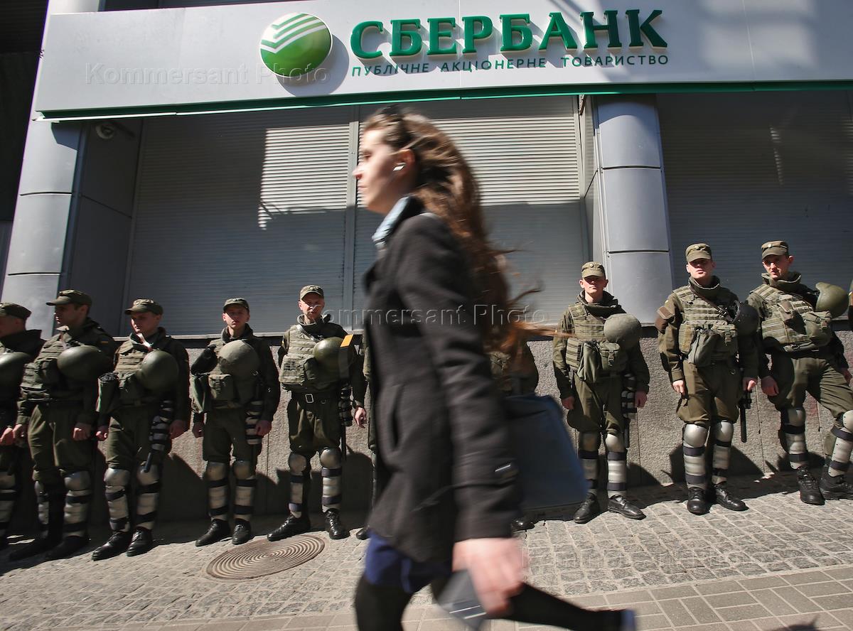 Members and supporters of the National corp political party protest outside a branch of Russia's…