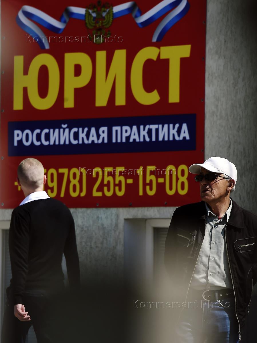 Жанровая фотография. Рекламный щит "Юрист. Российская практика" на одной из улиц Симферополя.