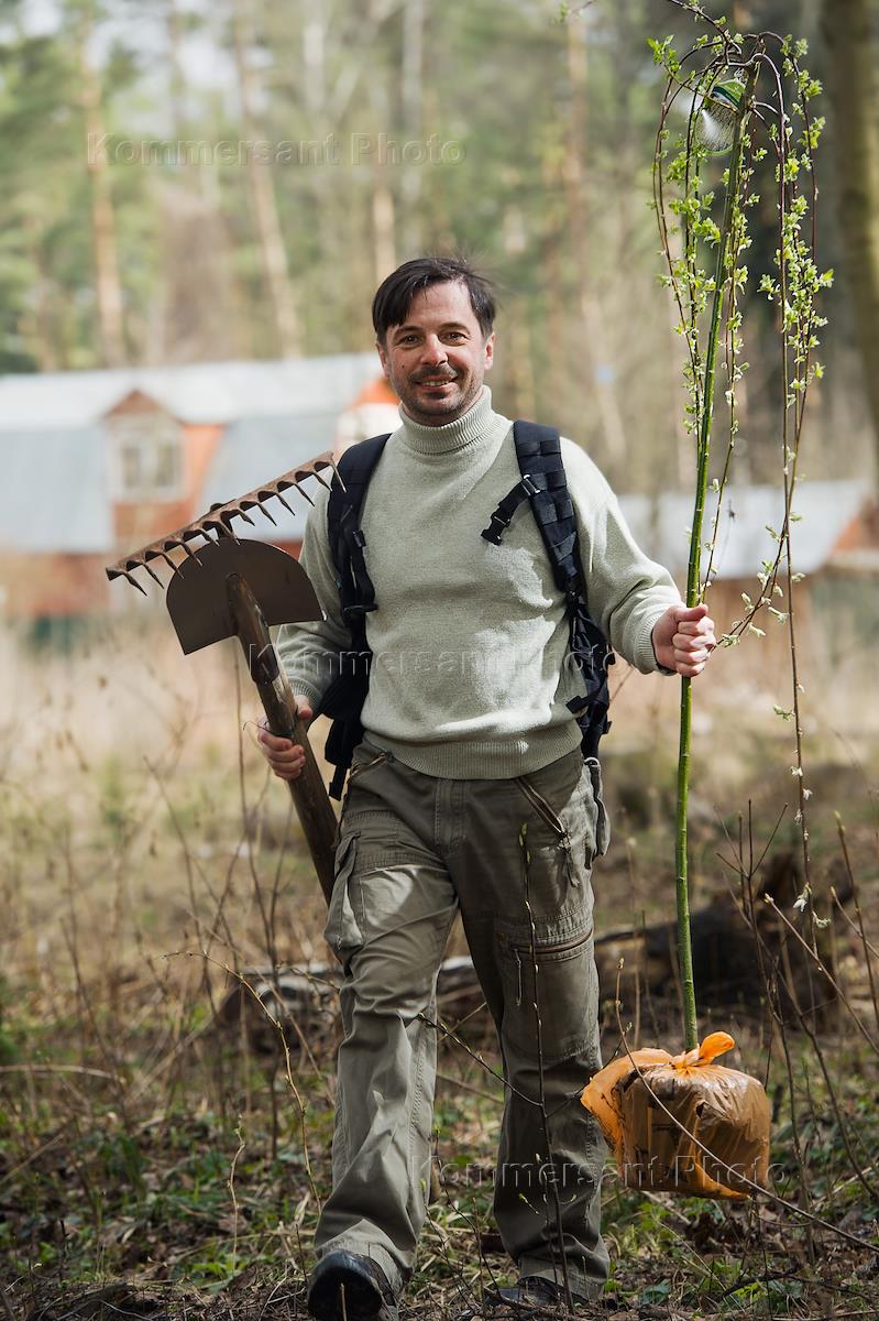 Жанровая фотография. Дачник готовится к сезону. Мужчина с саженцем дерева, граблями и лопатой на…