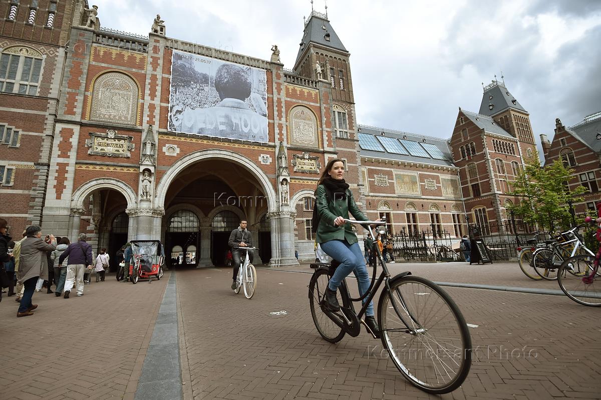 Виды Амстердама. Мужчина на трехколесном велосипеде с собакой на поводке во время прогулки.