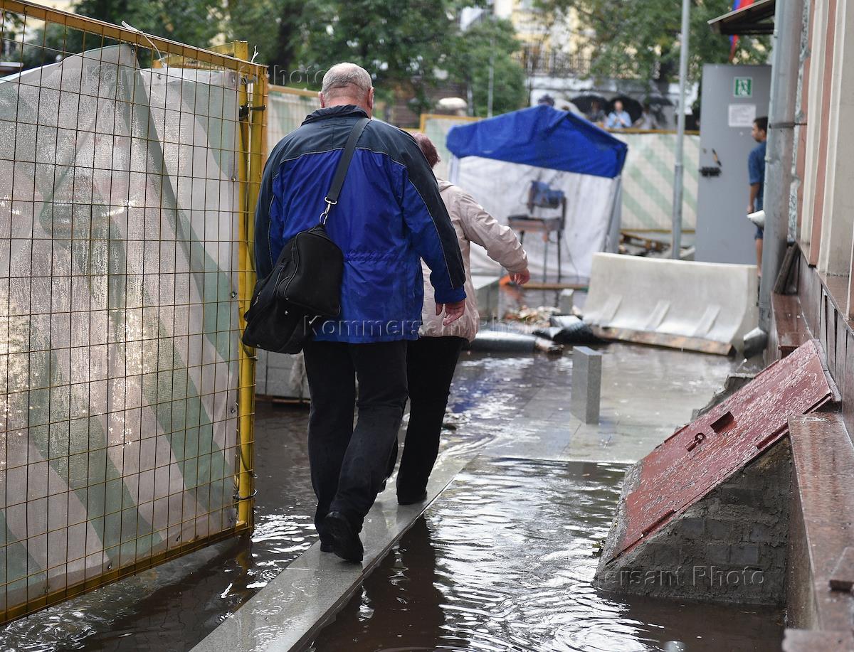 Жанровая фотография. Прохожие, засучив брюки идут босиком по улице, залитой дождем.