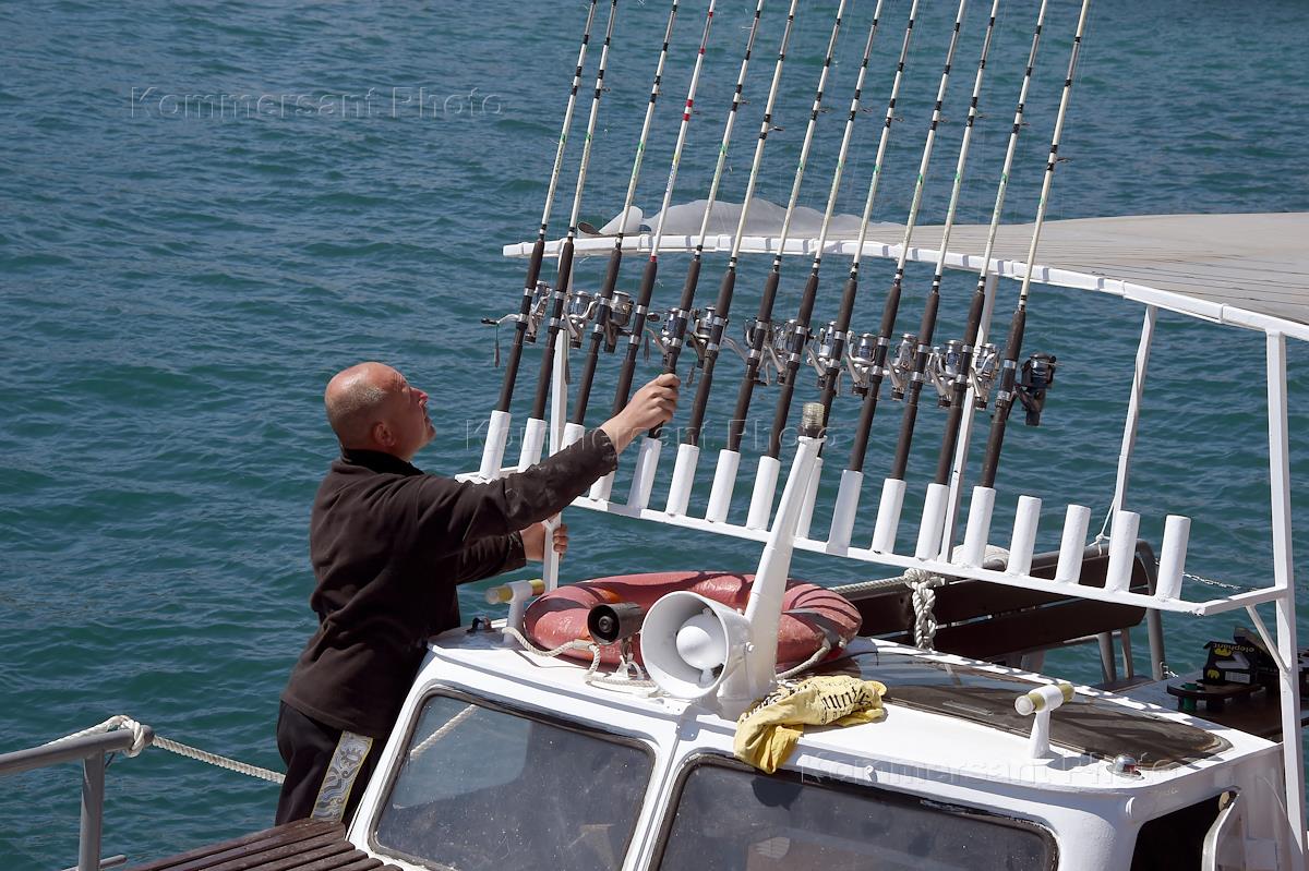 Жанровая фотография. Туристические услуги в Крыму. Морская рыбалка. Прогулочный катер у пирса.