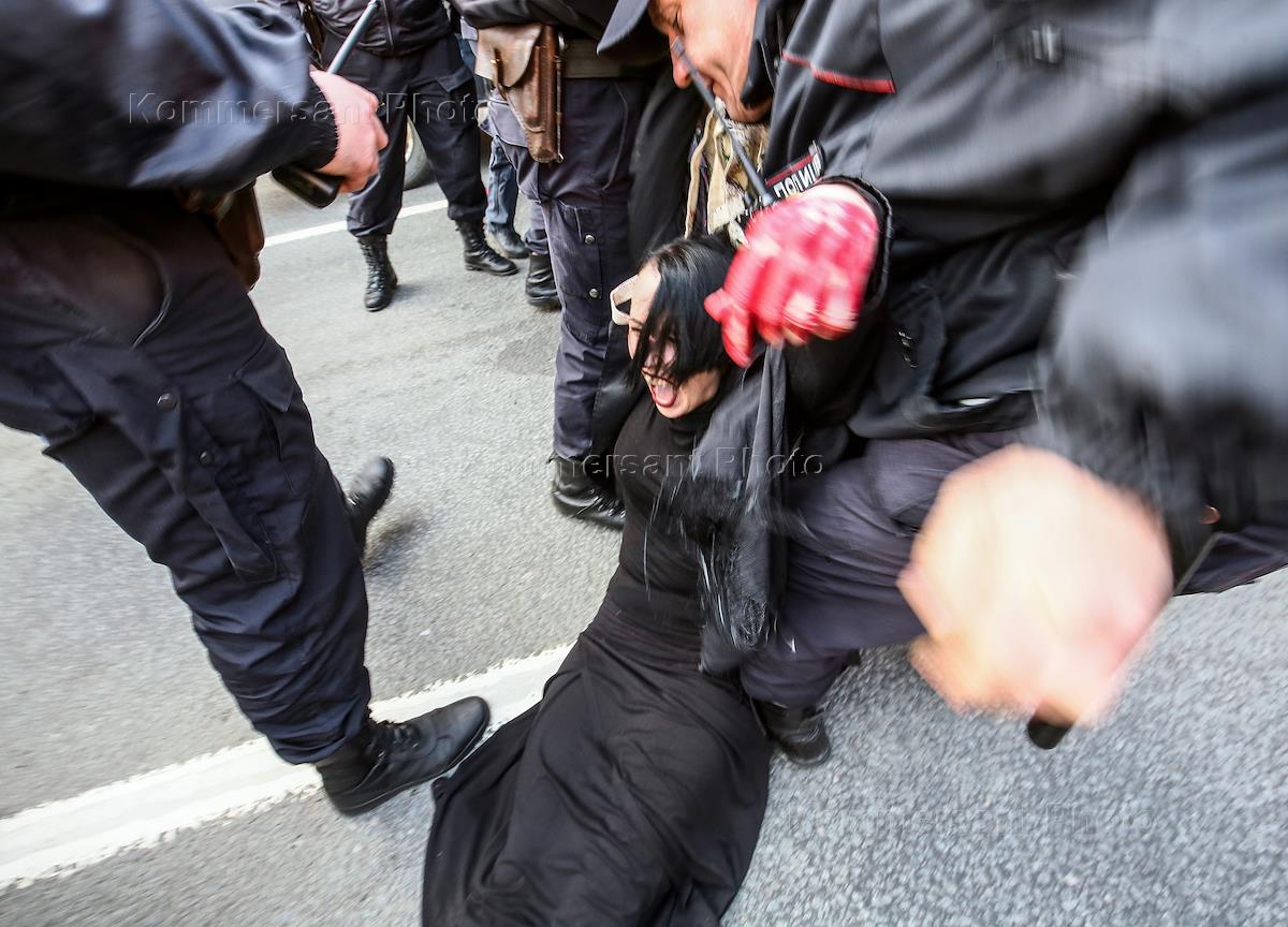 Участники акции против убийства мужчин-геев в Чеченской Республики на Невском проспекте. Сотрудники…