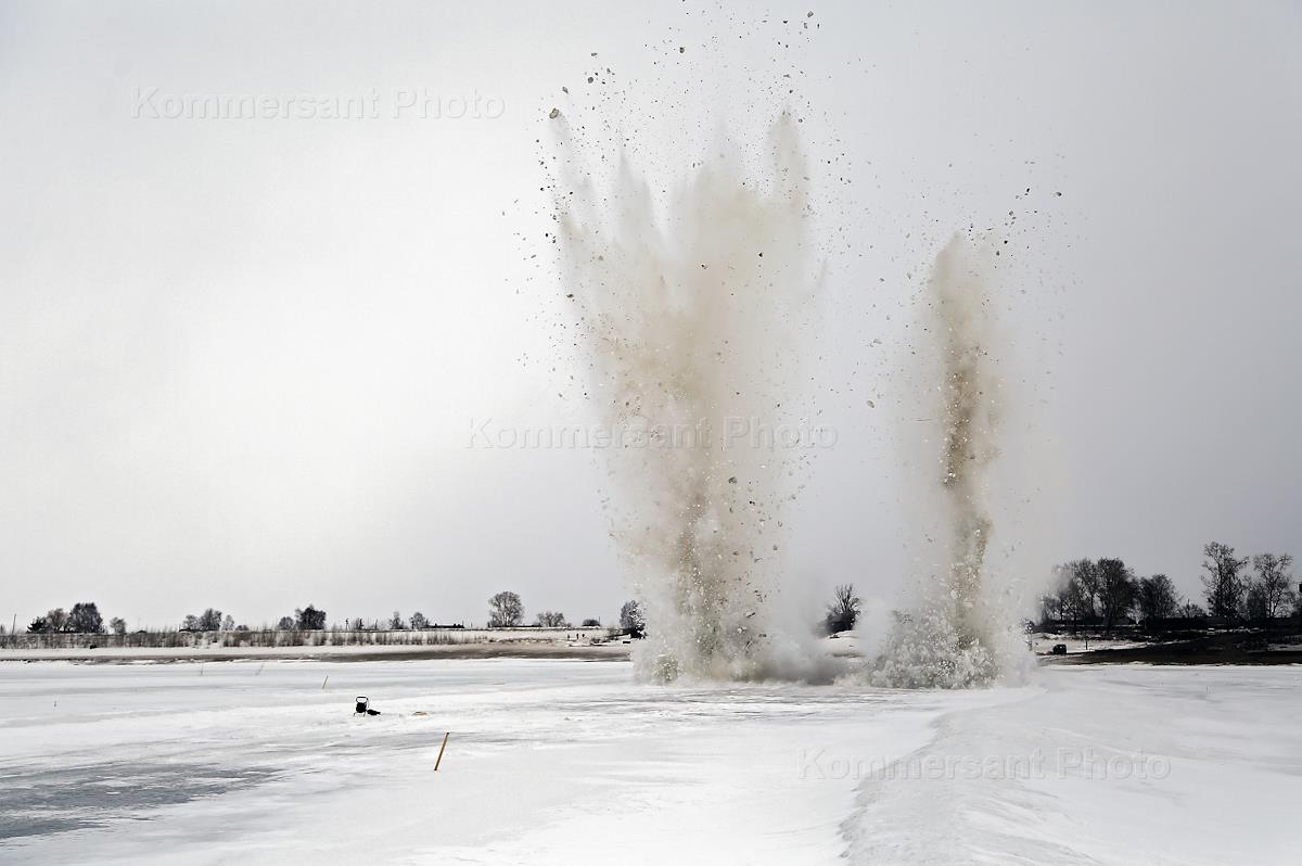 Экология Сотрудники главного управления МЧС по Томской области во время проведения ледовзрывных работ на затороопасном участке реки Обь на переправе Нарга – Могочино на севере Томской области.