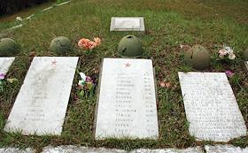 Братские могилы солдат Великой отечественной войны с касками с изголовьях.