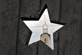 Жанровая фотография. Вид церкви сквозь прорез в заборе, выполненный в виде пятиконечной звезды .