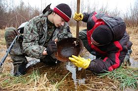 Бойцы поискового отряда во время поисков останков солдат Великой отечественной войны. Мальчик…