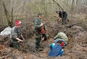 Бойцы поискового отряда во время поисков останков солдат Великой отечественной войны.