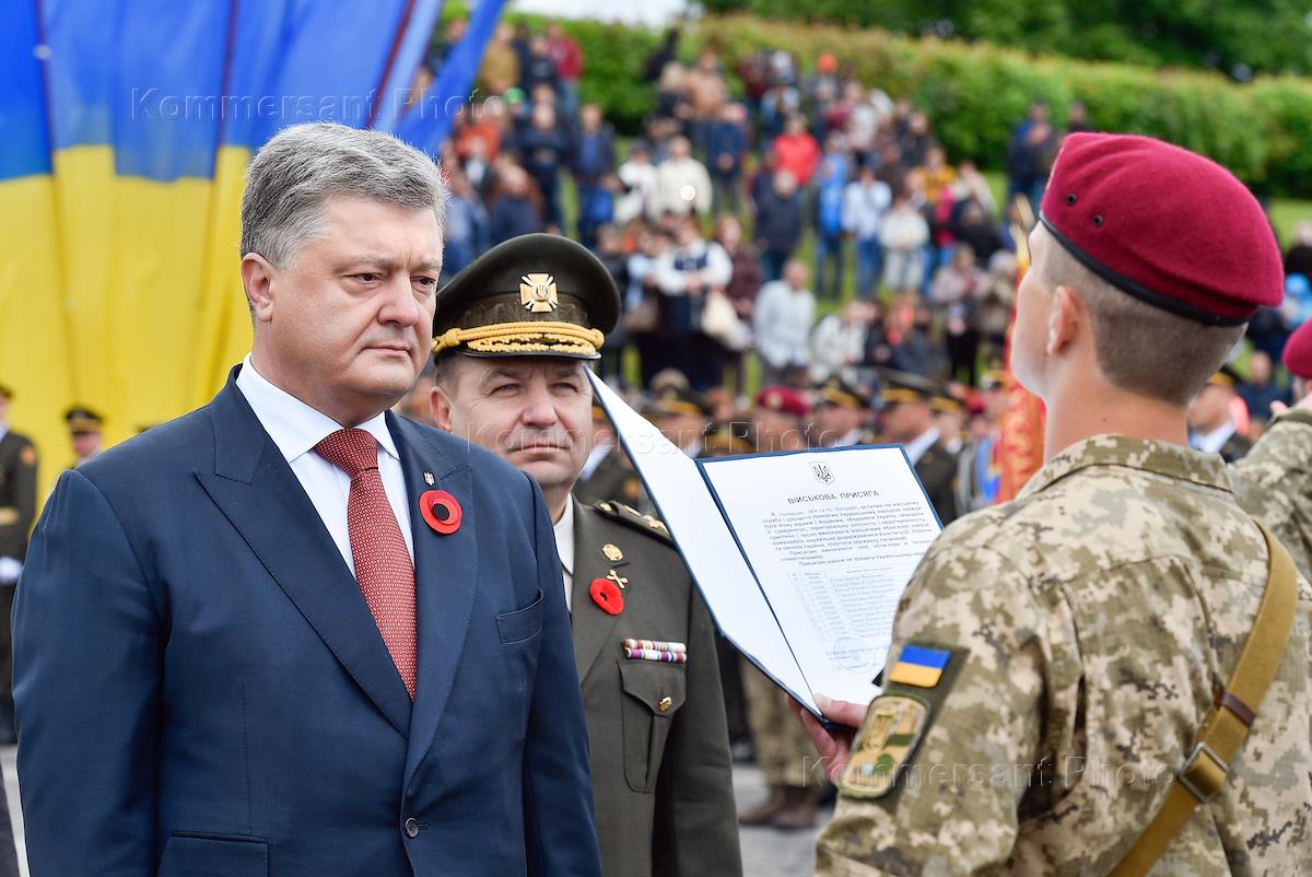 Президент Украины Петр Порошенко (в центре) во время присяги новобранцев Отдельного полка Президента…