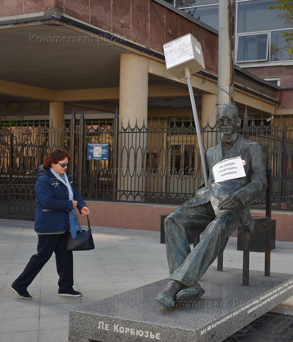 Виды Москвы. Памятник французскому архитектору Ле Корбюзье на Мясницкой улице. Плакат на памятнике…