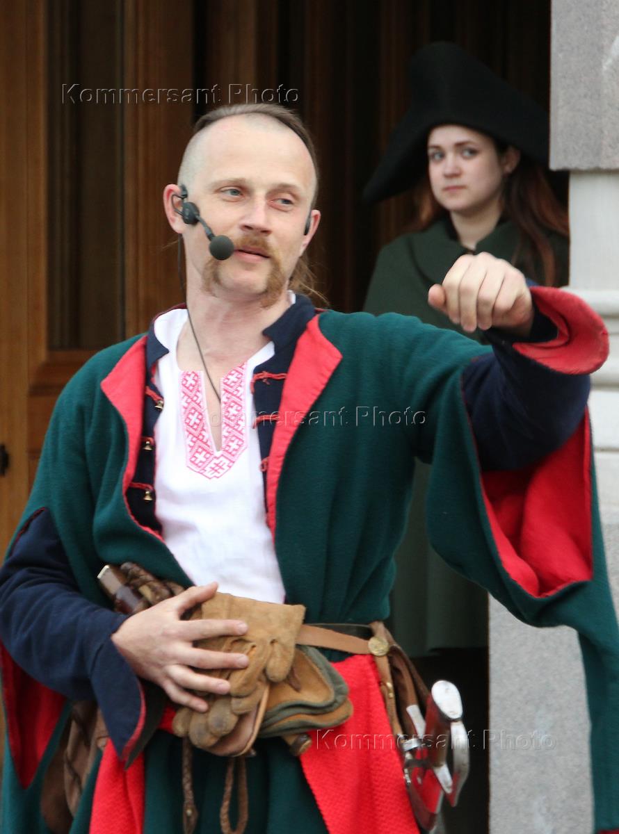 Ночь музеев. Участники исторической реконструкции в облике запрожского казака перед зданием музея …