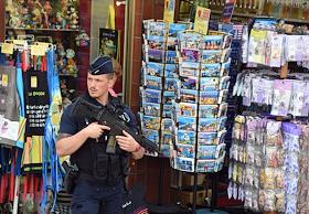 Виды Канн во время проведения Каннского фестиваля. Полицейский у входа в сувенирный магазин.