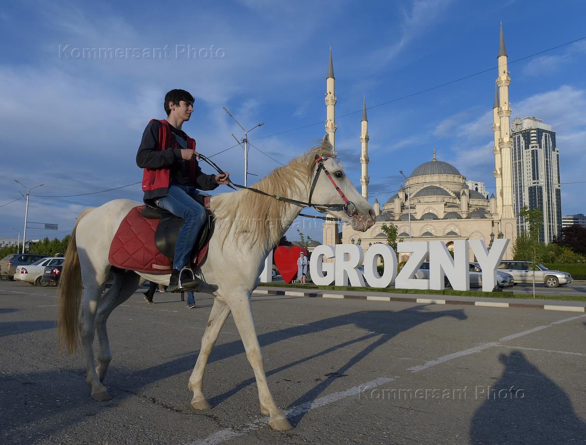 Виды города Грозный. Люди на площади пере мечетью "Сердце Чечни" имени Ахмата Кадырова.