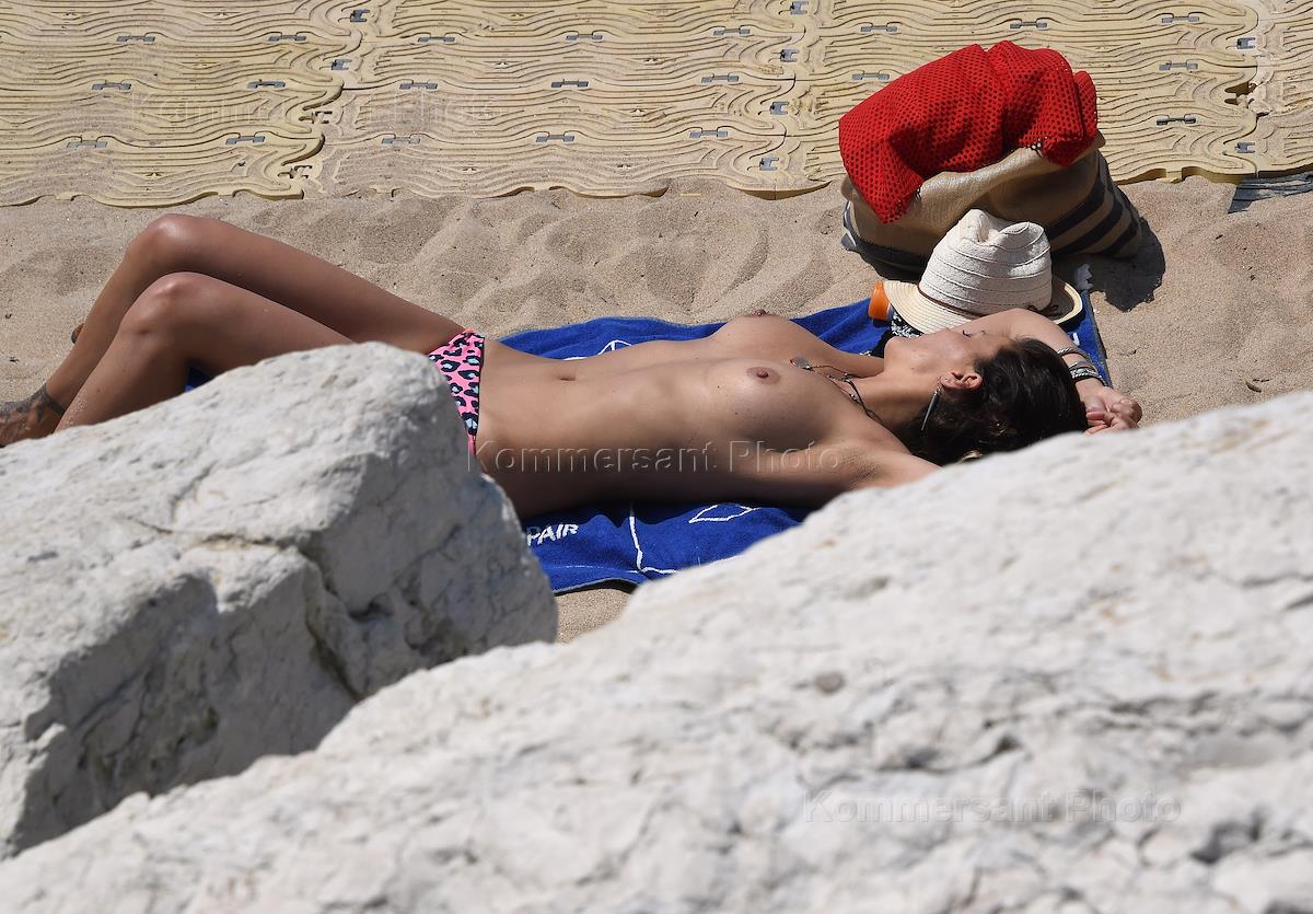 Жанровая фотография. Женщина загорает топлесс на пляже.
