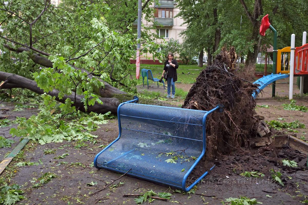 Последствия грозы и сильного ветра в Москве. Вырванные с корнем деревья на детской площадке.